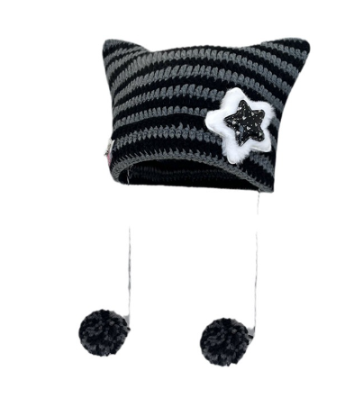 Біні шапка з вушками і зіркою в стилі аніме k-pop в'язана демісезонна чорно-сіра